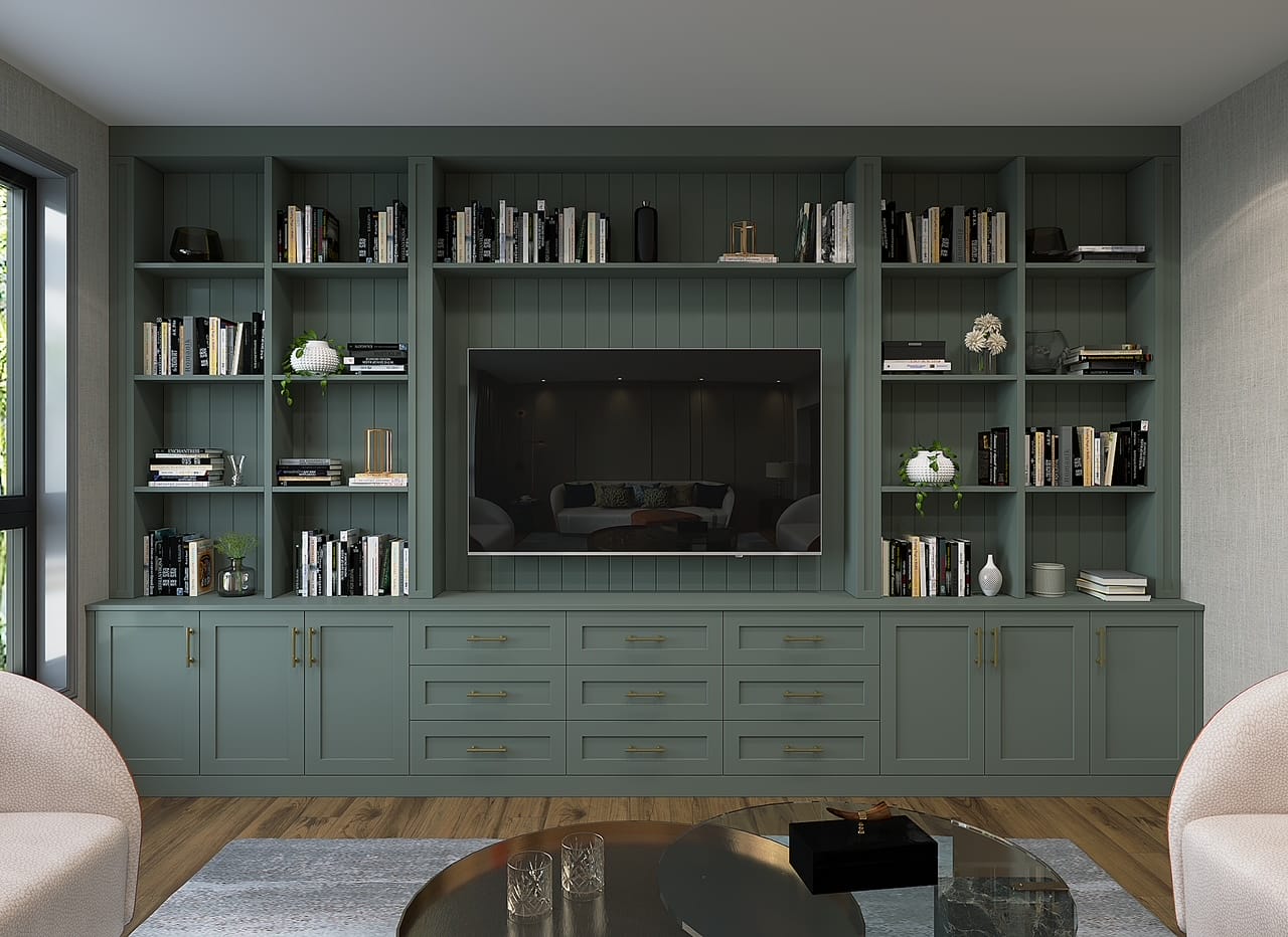 - Living room – a fully fitted media wall creates a focal point in the room and gives you space to store your games systems, family photographs, book collection or vinyl record player.
